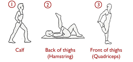 First, some basic principles: getting the stretch right is far more important than the number of stretches so concentrate on form. For each stretch hold it for between 15-30 seconds. This releases the muscle while at the same time not over-stretching.