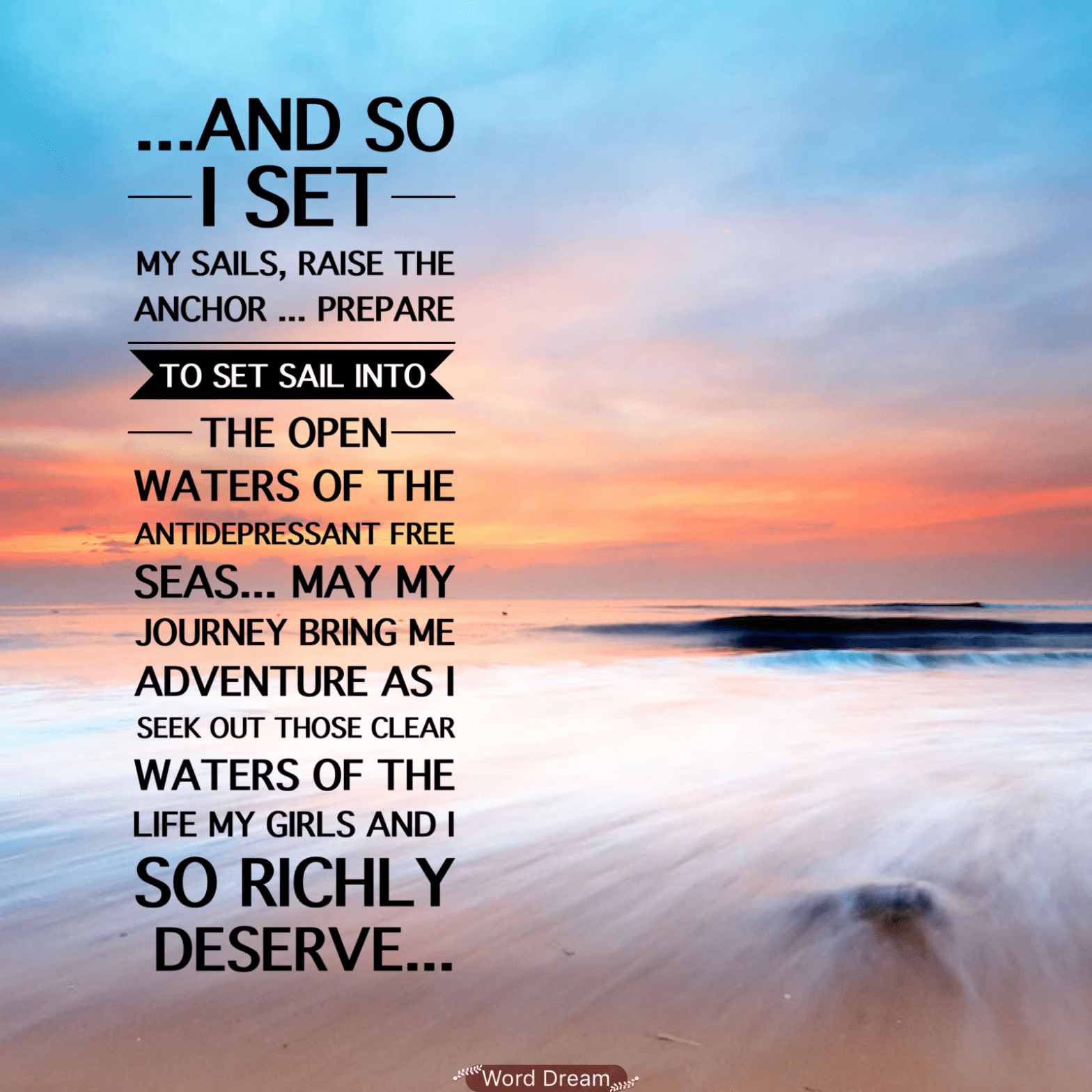 And so I set my sails, Raise the anchor … Prepare to set sail into the open waters of the antidepressant free seas … May my journey bring me adventure as I seek those clear waters of the life my girls and I so richly deserve… This will be my second journey out into theseContinueContinue reading “Setting sail into antidepressant free seas – #antidepressants #inspiration #hope #depression”